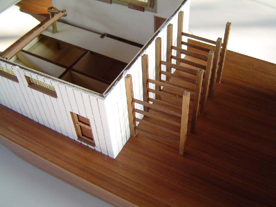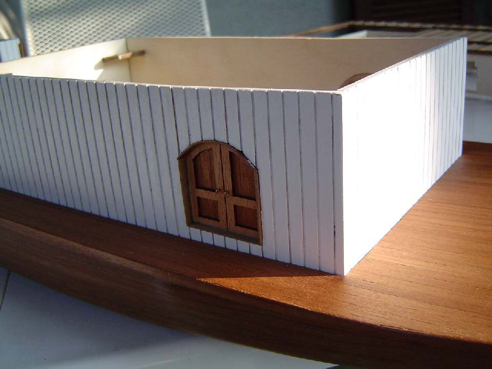 Figur 9 - Lagerraum. Nachdem man die Teile Nr. 2324-25 vereint hat und die Verkleidung und Lackierung durchgeführt hat verkleidet man auch das Innere mit Leisten von 1x4 mm der Türen des Maschinenraums Nr. 26 und die des Lagerraums Nr. 27-28. Bevor man sie in ihrer endgültigen Position festklebt, lackiert man mit Klarlack und befestigt die Griffe, die aus Ringen bestehen, wie auf der Zeichnung zu erkennen ist. Nach beendeter Arbeit bringt man die beiden Komplexe in Position und fixiert sie mit einigen Tropfen schnelltrocknendem Cyanacrylkleber.